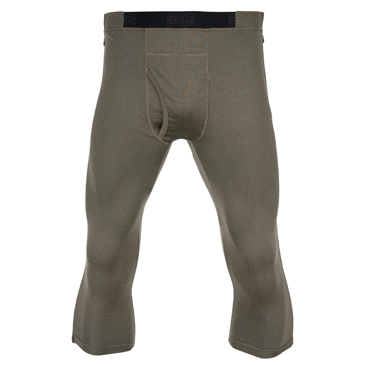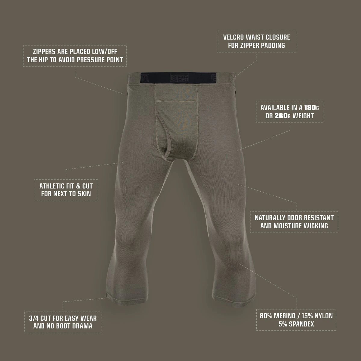 Our new Merino Long John briefs can be zipped off without the removing pants/boots for convenient and quick release of heat. They are 3/4 length for easy wear and avoids the common boot/sock overlap drama. The zipper is intentionally placed low/off the hip/waist band to avoid pressure points when carrying a backpack. The zipper can also be zipped down to any desired height while they are worn to shed heat and eliminate pressure on hips due to the zipper. These Zip Off underwear are featured in a more rugged blend (80/15/5) in abrasion-heavy places for added durability. Available in two weights – 180G and 260G to fit your hunting/lifestyle adventures.