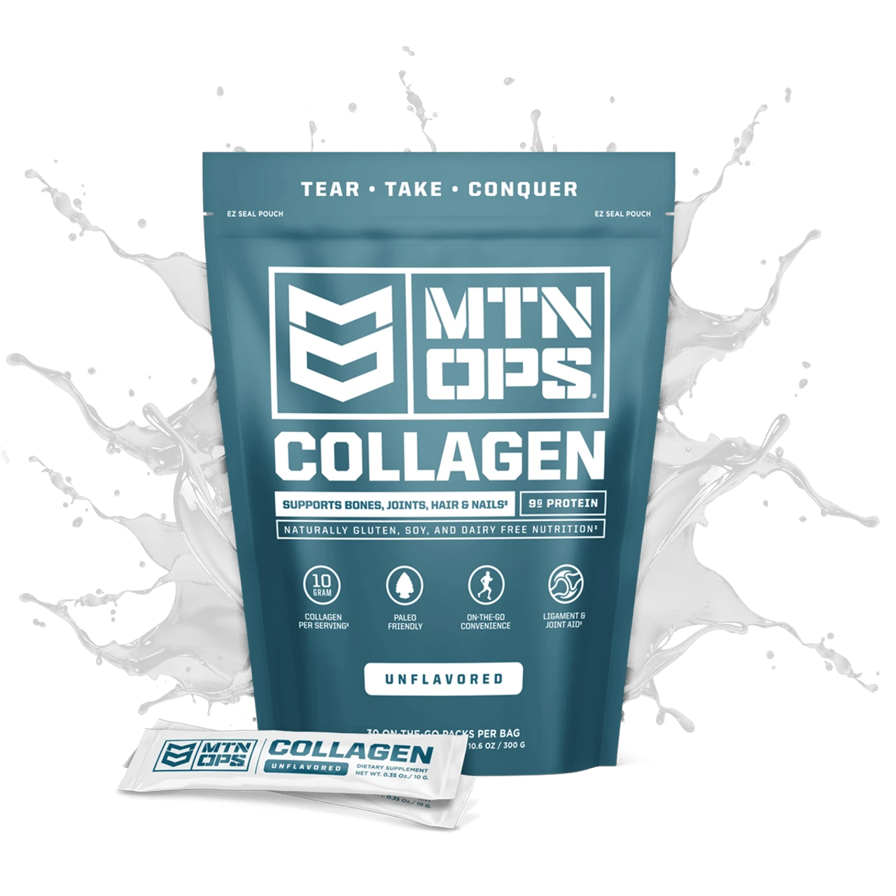 MTN OPS Collagen on-the-go packs are the perfect way to improve your diet with highly digestible protein. The flavorless collagen protein powder is perfect to mix into your favorite beverage or smoothie for instant nutritional improvement. Additionally, collagen is known to support healthy bones, tendons, ligaments, and other connective tissue throughout your body. Each pack contains 9 grams of protein that promotes a healthy complexion, body and diet. MTN OPS Collagen will help you function and feel better.