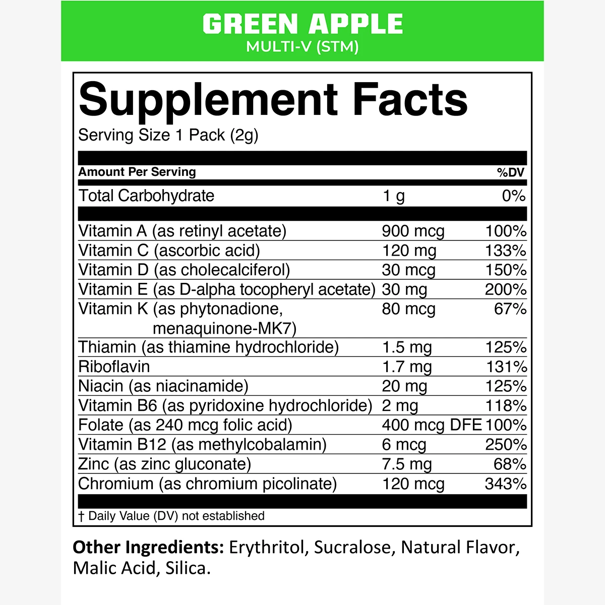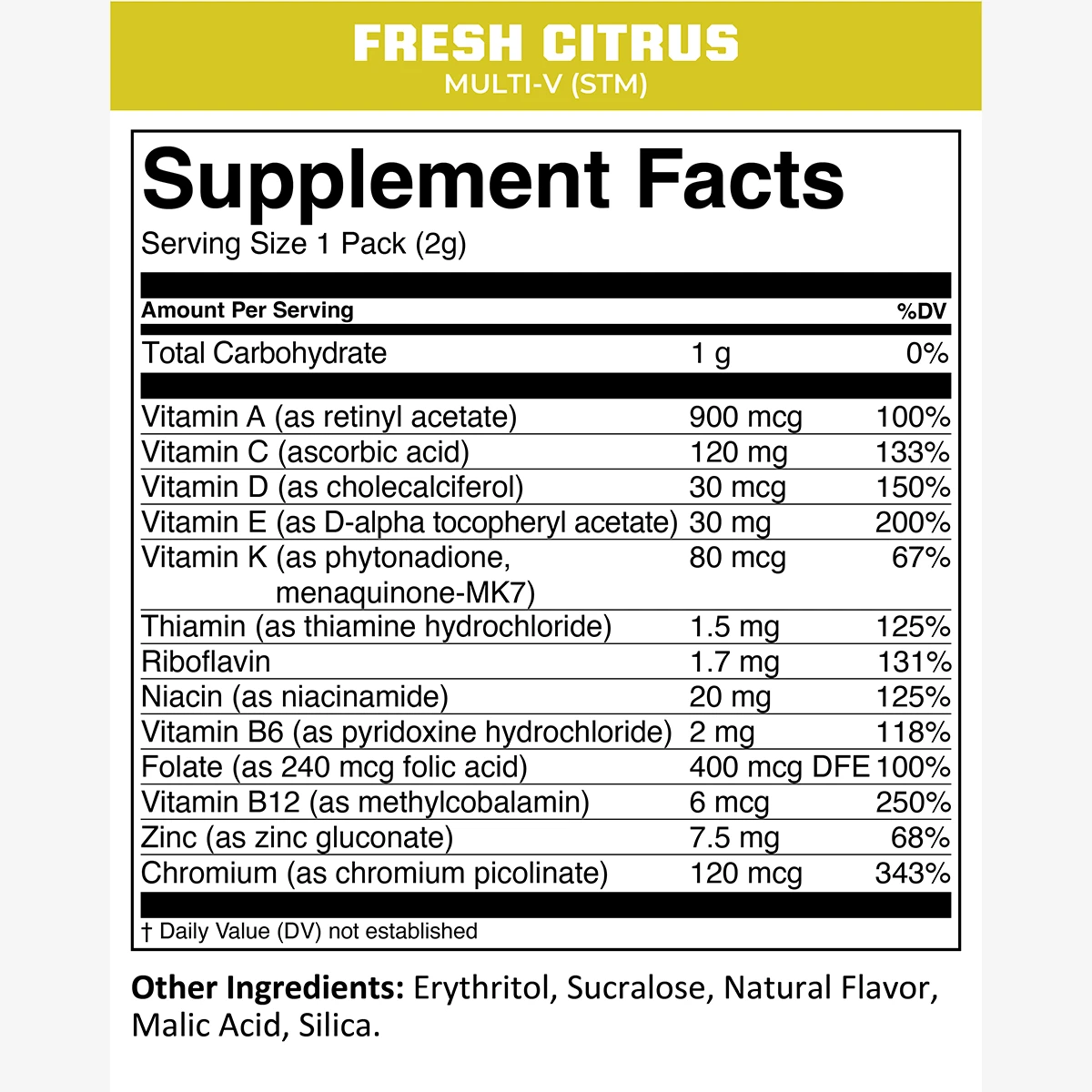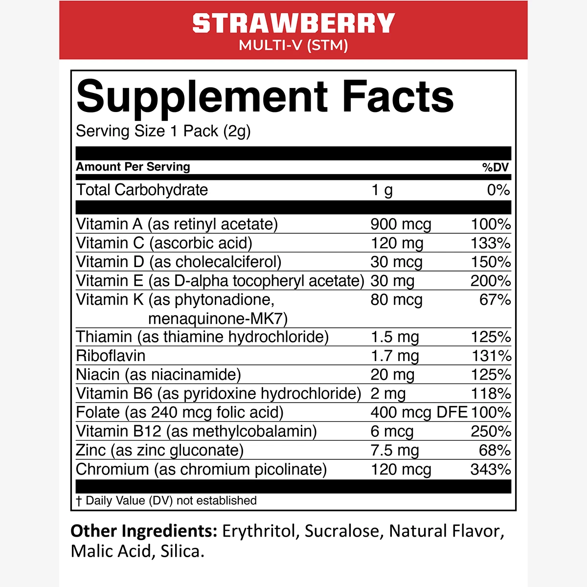 Straight-to-mouth (STM) Quick Sticks MULTI-V is a daily multivitamin with all the essential nutrients, vitamins, and minerals you need to maintain a healthy and energetic lifestyle. Improve your overall health and prepare for your next outdoor adventure with the convenience of our STM Quick Sticks.